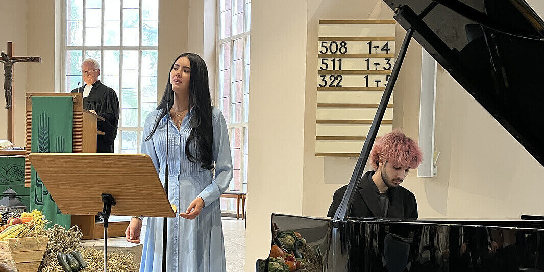 Frau steht am Mikrofon und singt, daneben sitzt ein Mann am Klavier