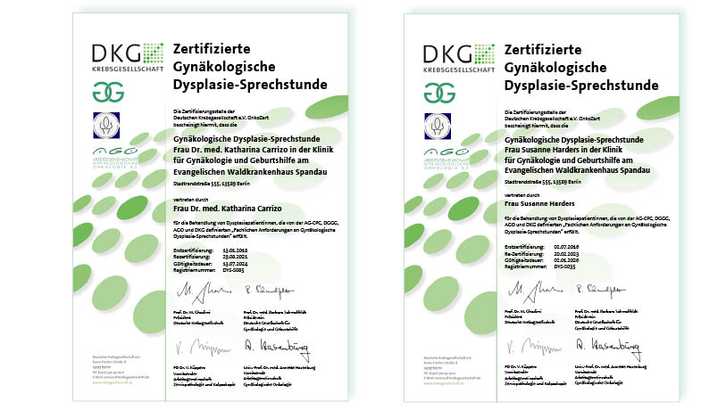 Die gynäkologische Dysplasie-Sprechstunde von Dr. med. Katharina Carrizo und von Susanne Harders erfüllt die fachlichen Anforderungen der Deutschen Krebsgesellschaft, der Deutschen Gesellschaft für Gynäkologie und Geburtshilfe, der Arbeitsgemeinschaft Zervixpathologie und Kolposkopie und der Arbeitsgemeinschaft Gynäkologische Onkologie.