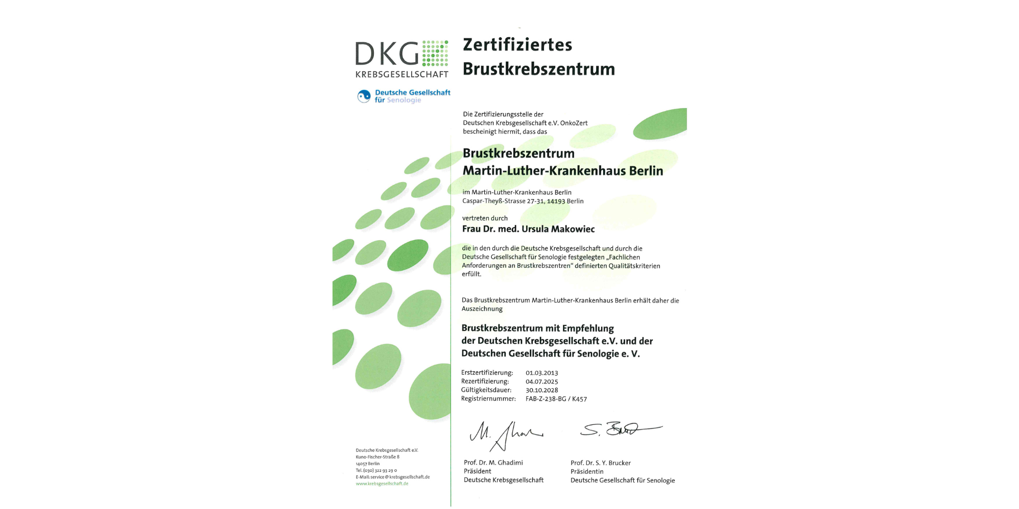 Das Zertifizierungsaudit durch zwei Auditorenteams von OnkoZert und ClarZert hat im März 2013 die Erstzertifizierung des Brustzentrums bestätigt. Für die Patient*innen bedeutet die Zertifizierung der Klinik als Brustzentrum die Gewissheit, dass die gesamte Diagnostik und Therapie entsprechend der Leitlinien der Deutschen Gesellschaft für Senologie und der Deutschen Krebsgesellschaft (DKG) erfolgt. Die Klinik für Gynäkologie und Geburtshilfe hat die Zertifikation ohne Auflagen erhalten.