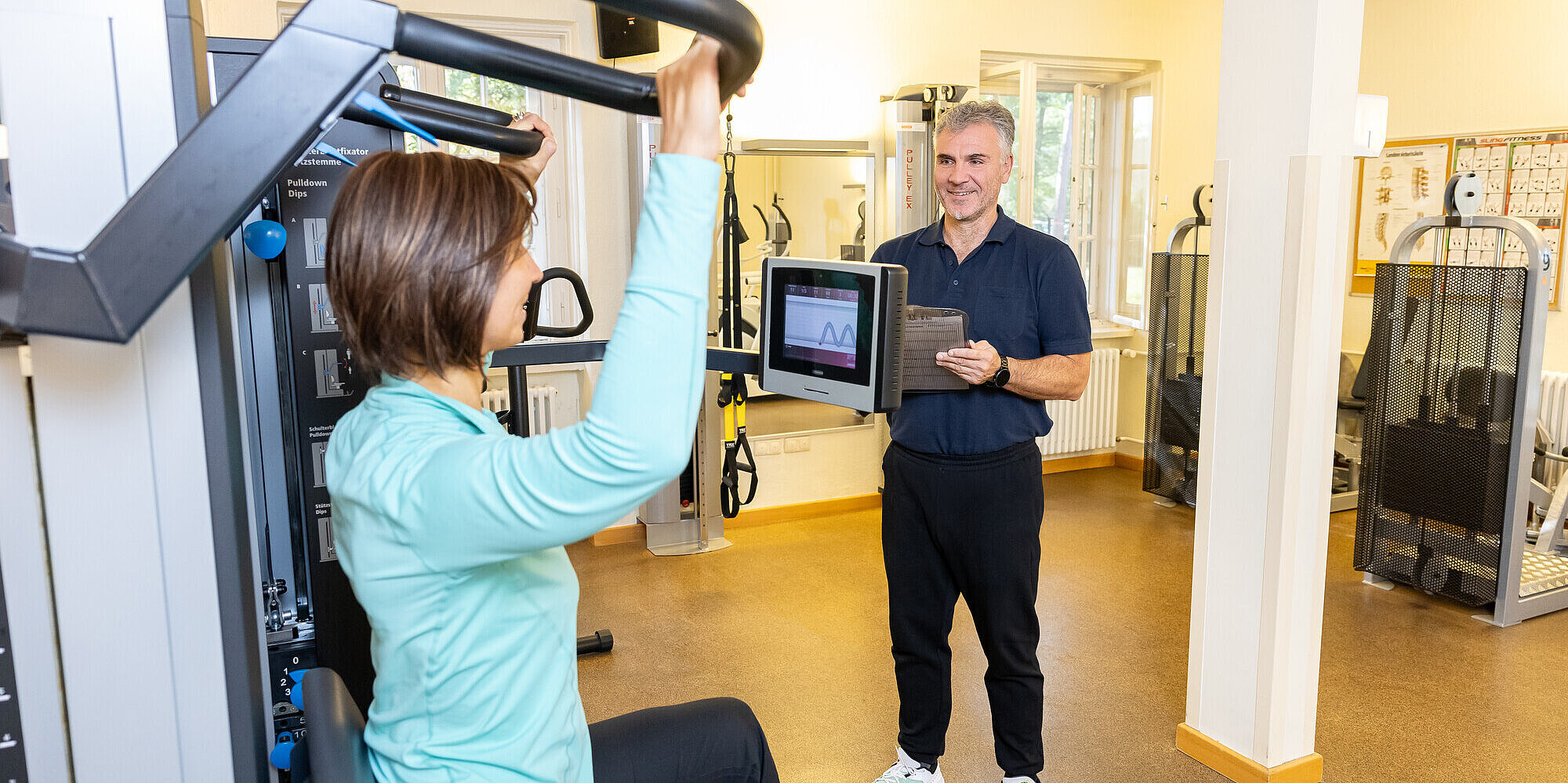 Unser qualifiziertes Therapeut*innenteam erstellt für Sie auf Grundlage eines Eingangsbefundes einen individuellen Trainingsplan, weist Sie an den Geräten ein und unterstützt Sie bei der korrekten Ausführung der Übungen. Unsere modernen computergestützten Feedback-Geräte ermöglichen ein genaues und kontrolliertes Kraft- und Koordinationstraining für die Beine, den Rumpf und die Arme.
