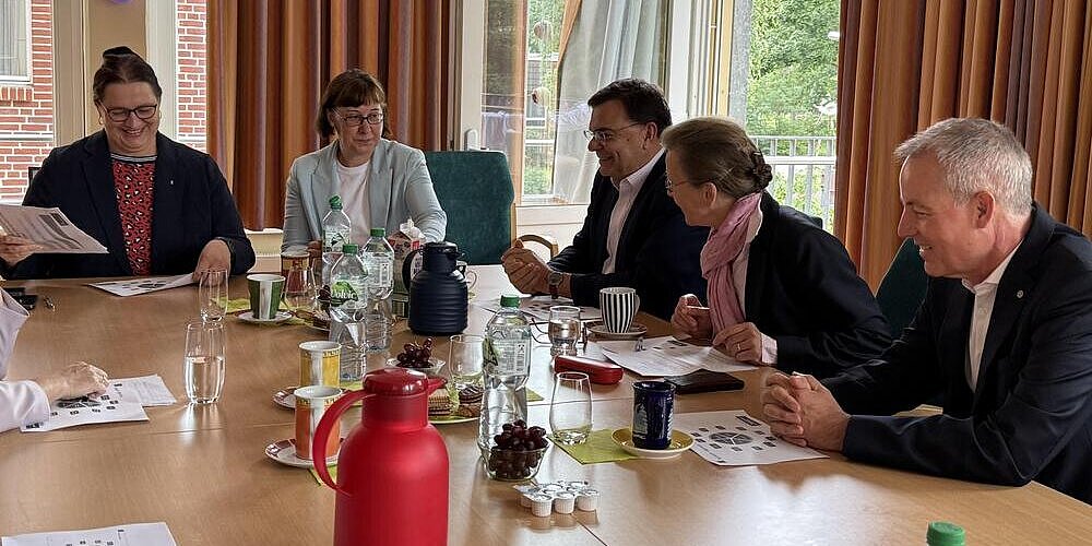 Staatssekretärin Ellen Haußdörfer informierte sich über die verschiedenen Hilfsprojekte der Johannesstift Diakonie – von Frühen Hilfen bis zur Versorgung Geflüchteter aus der Ukraine mit schweren Erkrankungen. Unter andere waren Andreas Mörsberger, Sprecher des Vorstandes und Prof. Dr. med. Lutz Fritsche, Vorstand Medizin, mit vor Ort.